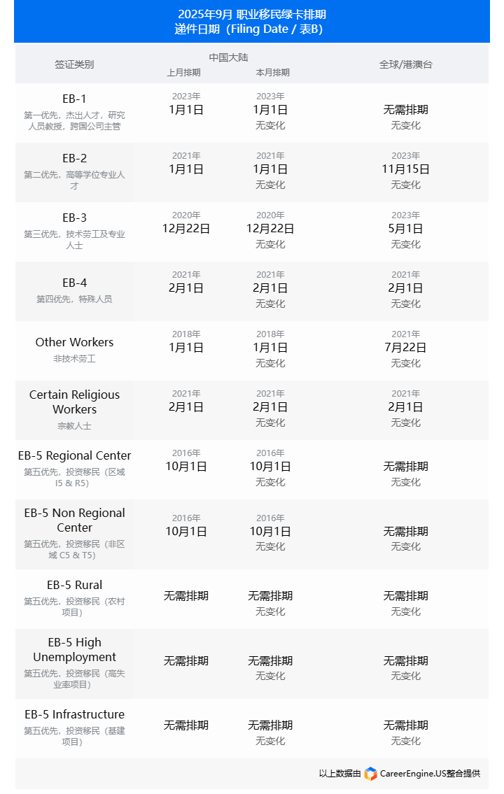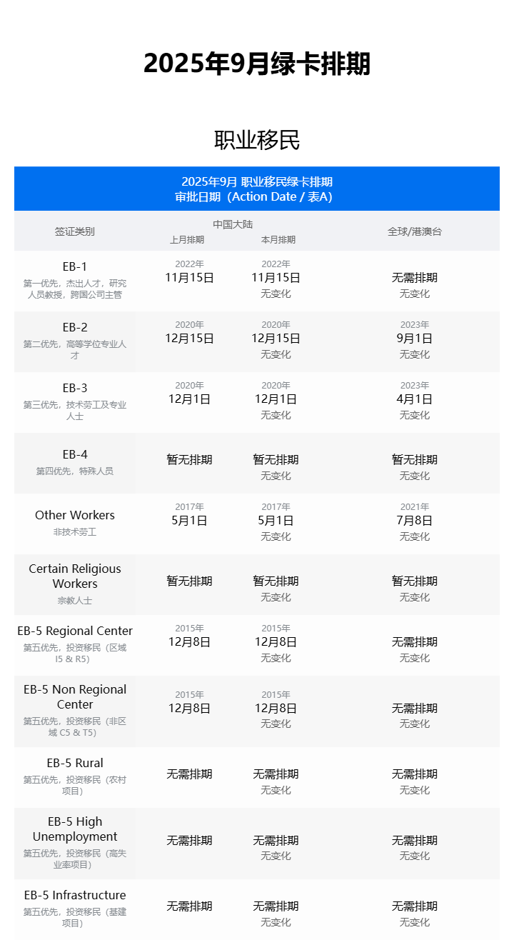 美国国务院签证办公室正式对外发布了 2025 年9月职业移民排期的详细情况。接下来,就让我们一同深入了解2025年9月排期的具体详情。