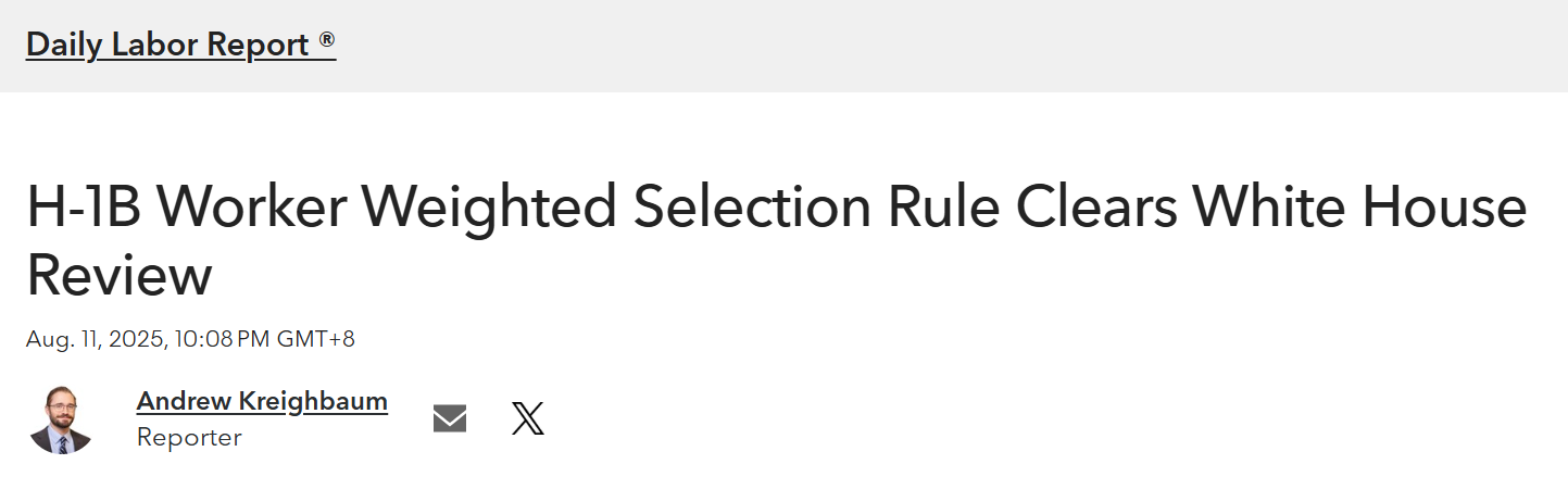 美国白宫行政管理和预算局(OMB)内的“信息和监管事务办公室(OIRA)”已于8月8日批准了一项关于改革H-1B签证分配方式的拟议规则。这意味着该规则已通过最终审核,可能很快就会正式公布并征求公众意见。
