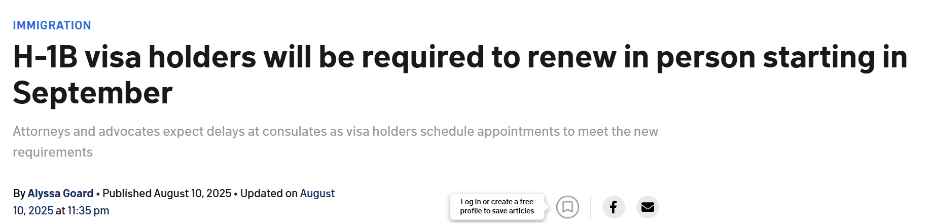 自2025年9月2日起,美国国务院将彻底收紧非移民签证的“免面谈”通道,连最受关注的 H-1B 也不例外:不论首次还是续签,所有海外H‑1B签证申请(包括续签)都得亲赴领事馆排队面试;持 H-1B 在海外续签不仅取消“Dropbox”(面签豁免),并且还需支付新增的“Visa Integrity Fee”(签证诚信费)。