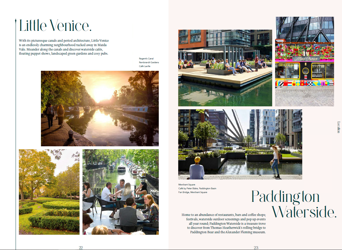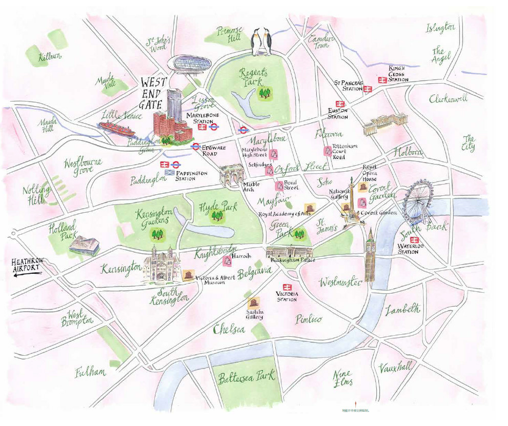 West End Gate的位置独特, 居于伦敦两大标志性公园之间:海德公园(Hyde Park)位于南面,东北面则是摄政公园(Regents Park),近处还有小威尼斯(Little Venice),如画的水景曼妙醉人,宁静的运河由此蜿蜒而出,穿越市中心,两岸伫立着大大小小 的咖啡馆与酒吧。