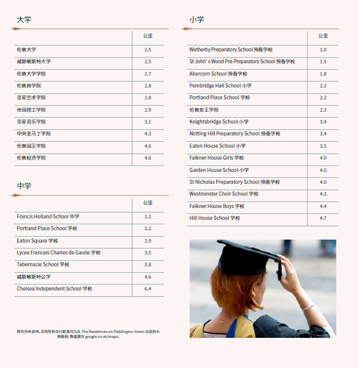 出行30分钟内可到达威斯敏斯特大学城、伦敦大学学院、皇家戏剧艺术学院、皇家艺术学院、皇家音乐学院、伦敦城市大学、伦敦国王学院等世界一流大学。