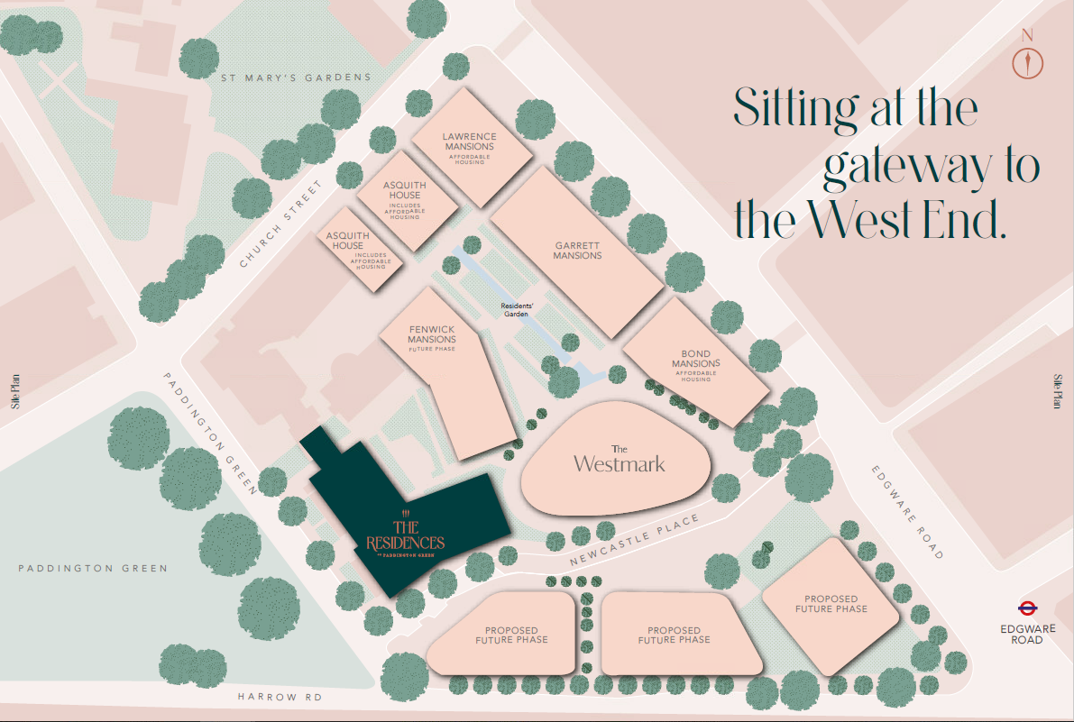 The Residences是项目新近开盘的一栋楼宇,一侧观小区内花园,另一侧是开阔且绿意盎然的帕丁顿绿园(Paddington Green),被舒适惬意的宁静绿地环绕。