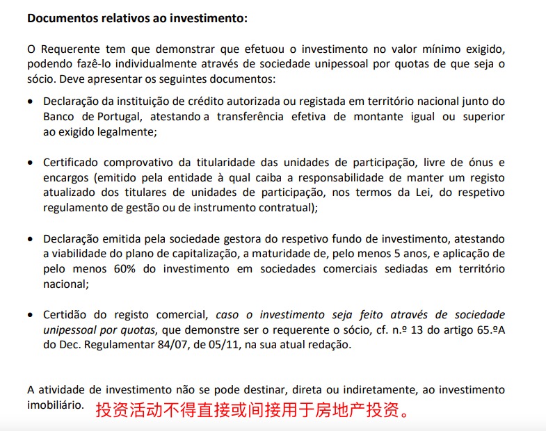 ✅vii) 转移资金金额不少于 500,000 欧元,用于购买在葡萄牙法律下设立的、面向企业资本化的投资基金或风险资本基金的份额,这些基金的投资期限在投资时至少为五年,且至少 60%的投资额用于在国内注册的商业公司;(房地产投向不适用)