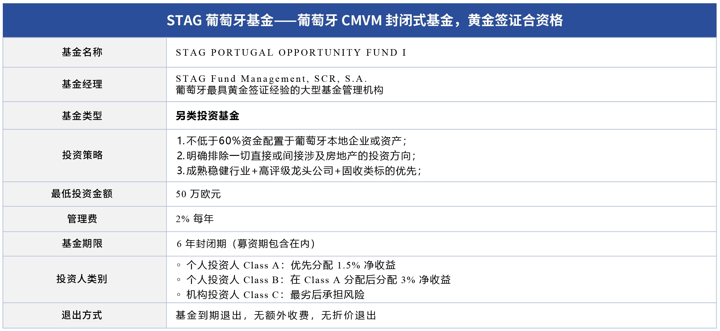 STAG葡萄牙基金投资人类别与收益分配机制