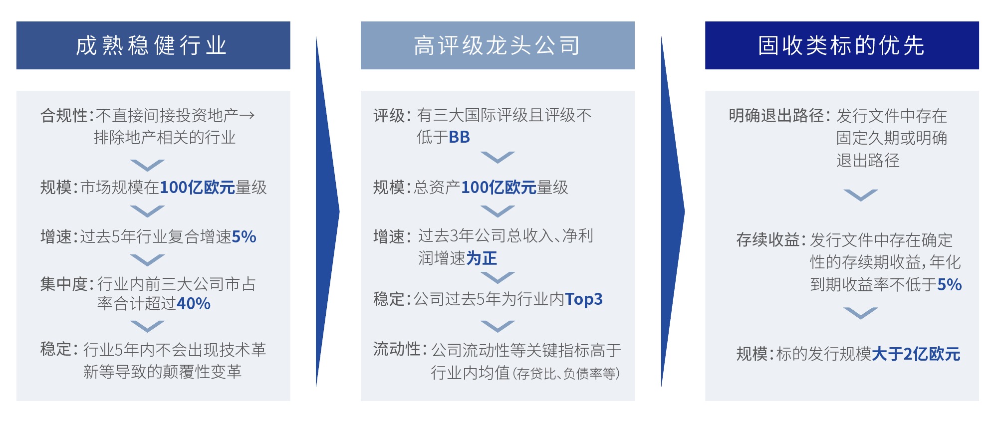明确具体的投资标准:成熟稳健行业+高评级龙头公司+固收类标的优先