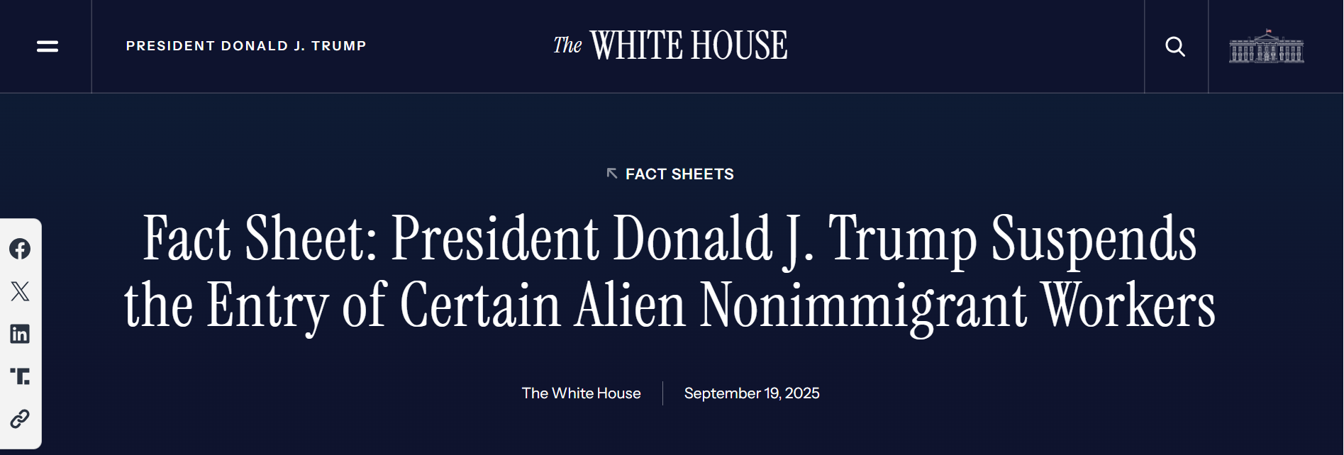 2025年9月19日,美国发布了一项公告,对打算持H-1B工作签证进入美国的人实施了新的限制,2026年开始实施。核心规定是,企业为身在美国境外的员工申请新的H-1B签证时,必须额外支付10万美元的费用!!!💥💥💥
