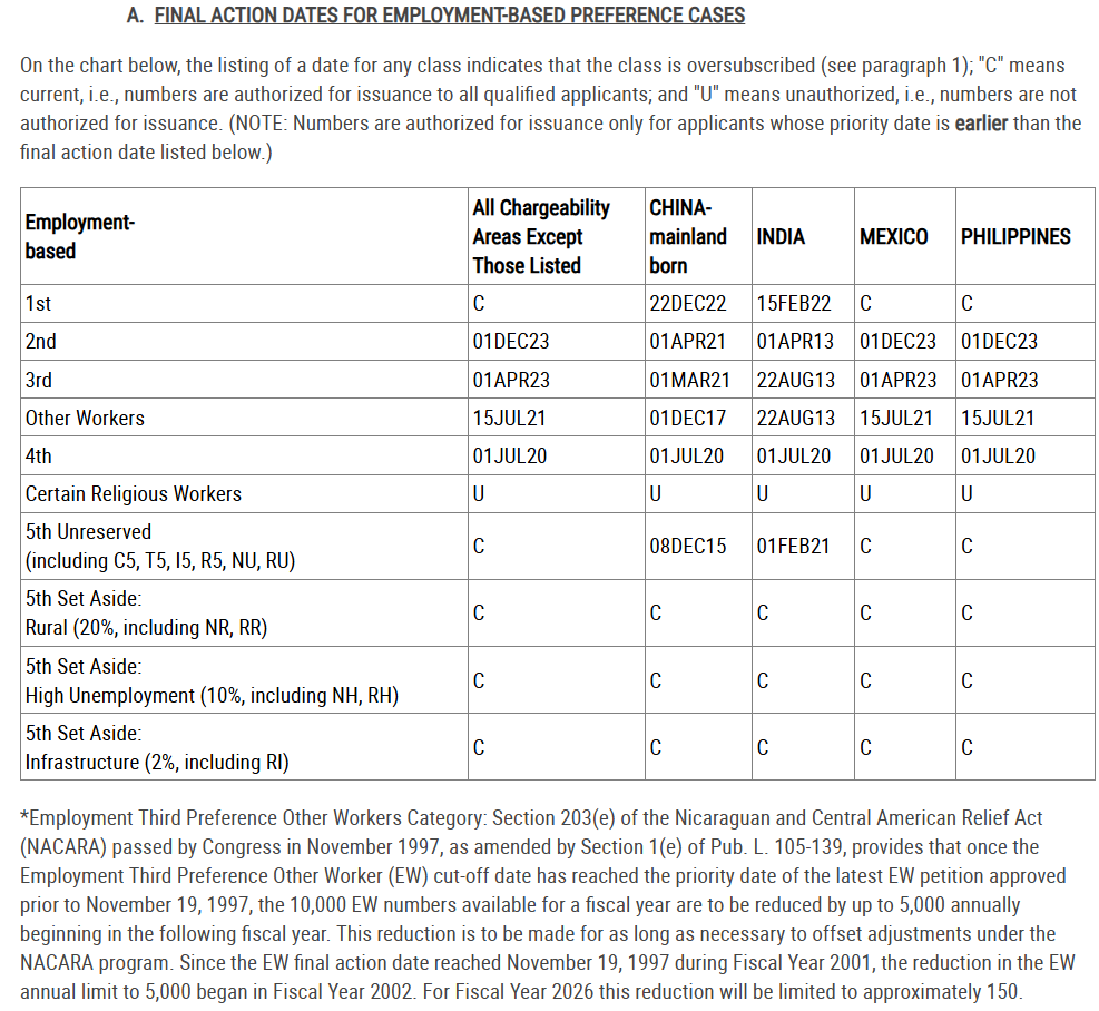 需要向大家说明一下,表A所体现的是具有签证名额的排期情况。也就是说,当您的排期日期早于表A上所显示的日期时,这就表明您将获得一个绿卡名额。