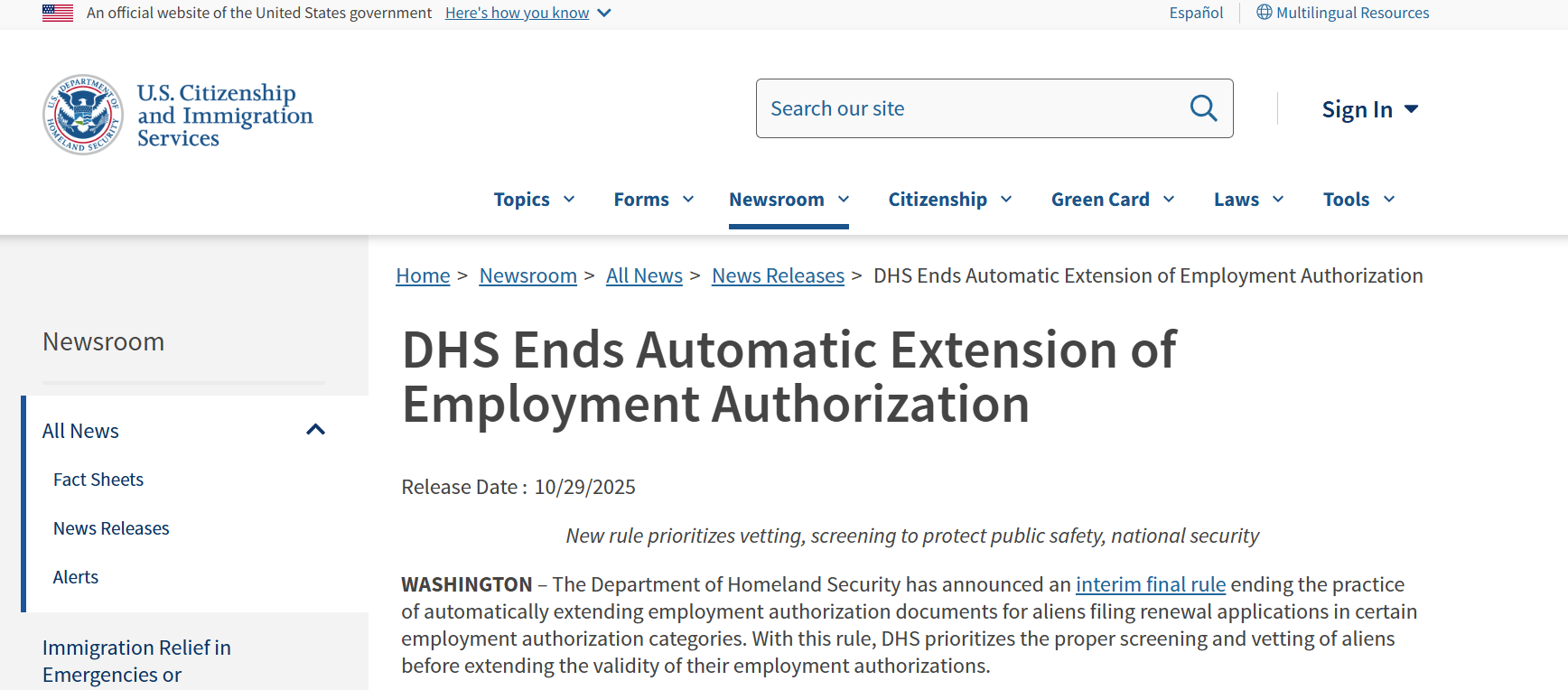 从2025年10月30日起,大部分工卡(EAD)持有者在申请续签时,将不再享有原有的最长540天自动延期保障。