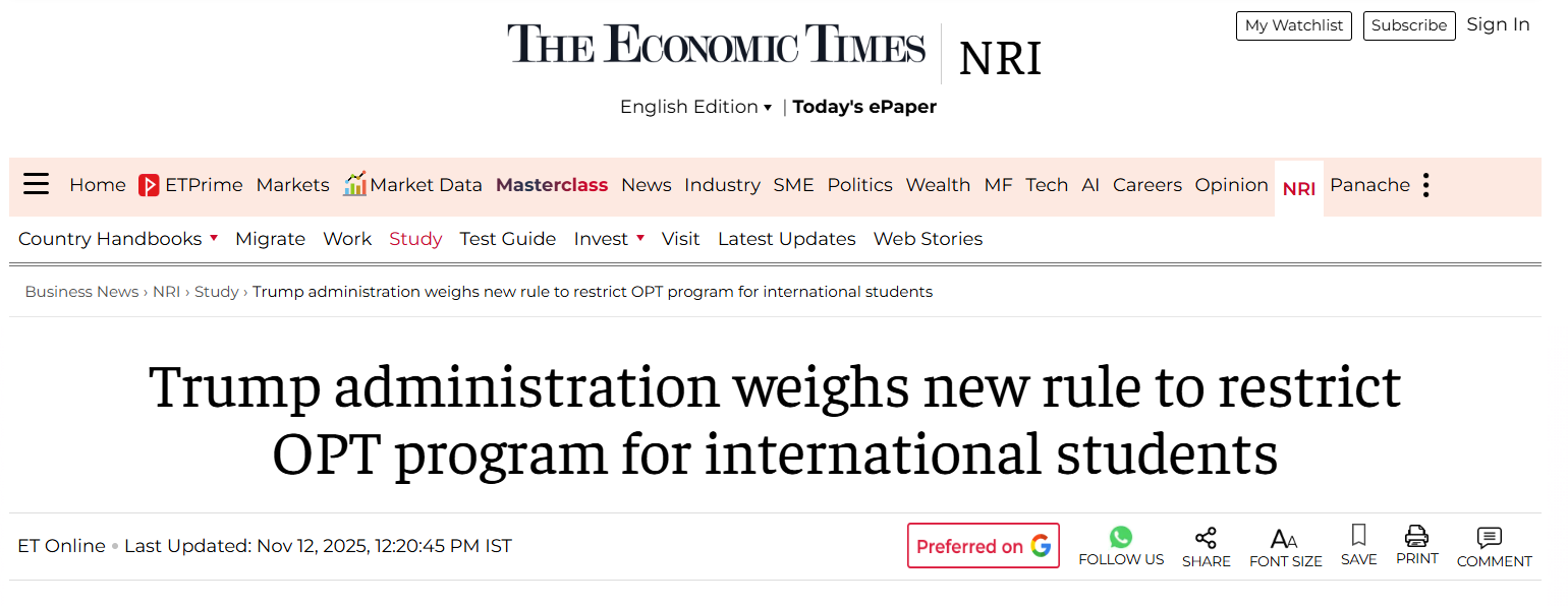 美东时间11月11日,美国各大主流媒体都在报道一件大事件——美国土安全部(DHS)宣布,美政府预计在2026年上半年出台新规,终止或限制国际学生OPT计划。