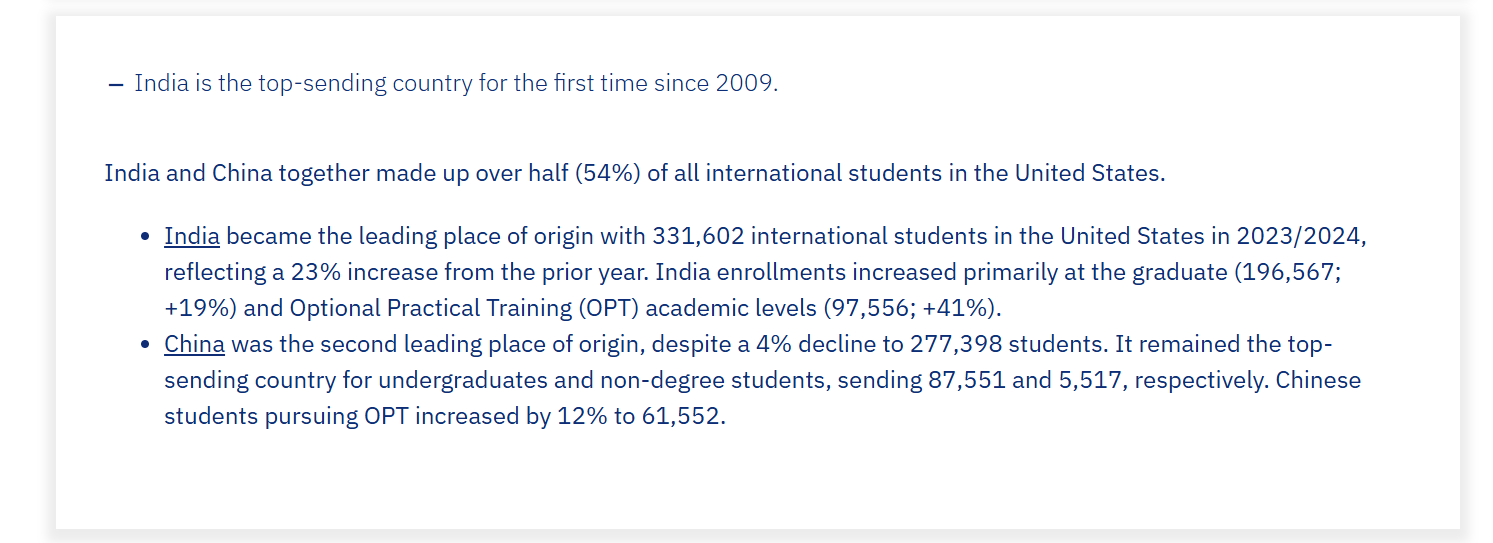 中国作为美国第二大留学生生源地,是本科生和非学位学生数量占全美第一。