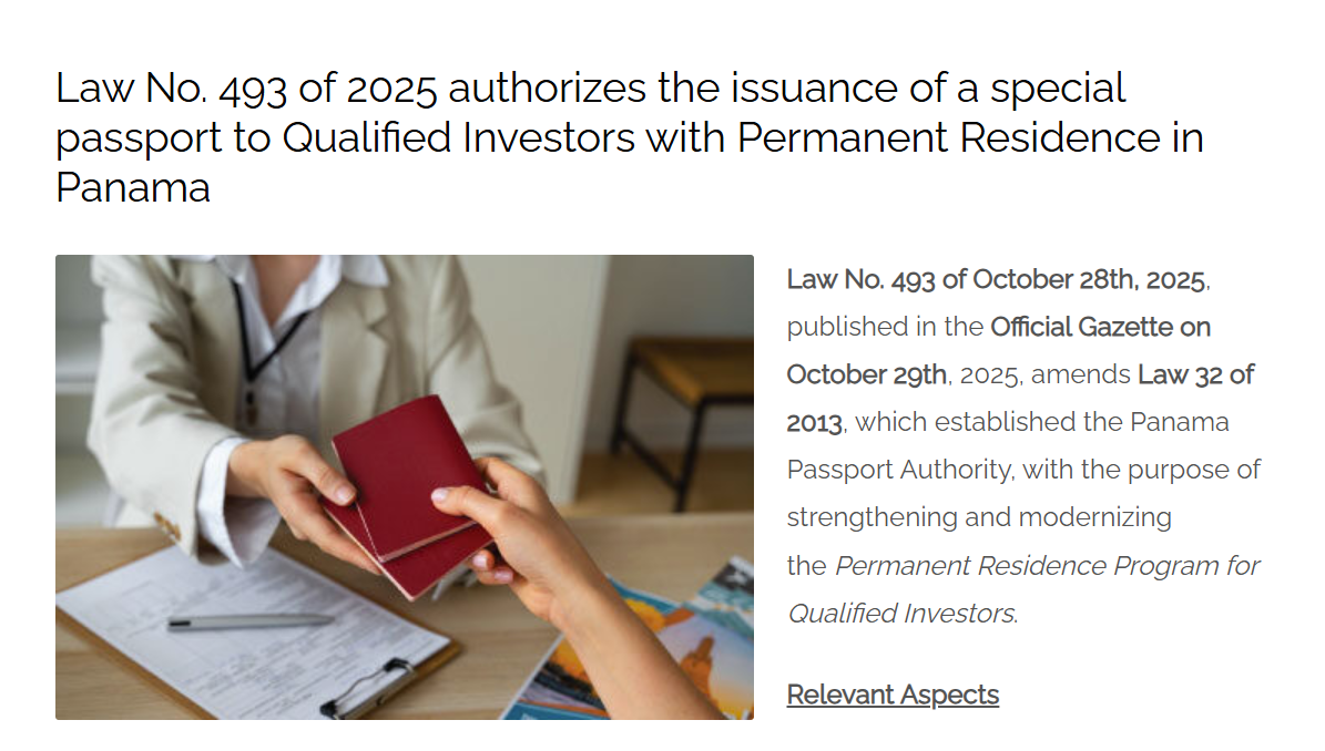 近日,巴拿马国民大会正式批准2025年第493号法律(原第299号法案),这项新法律进一步强化了合格投资者签证计划(The Qualified Investor Visa,QIV)。