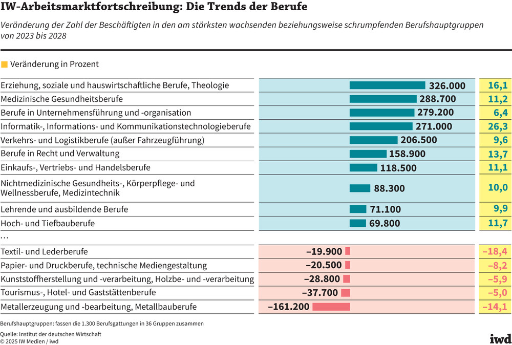 垫底的是金属加工行业——预计到2028年,这个行业会减少超过16万个岗位。另外,旅游业、塑料和木材加工、造纸印刷、纺织皮革等行业,就业人数也明显下降。