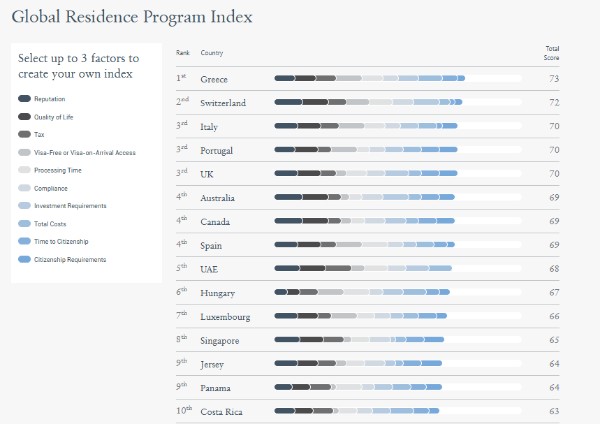 德约对希腊的喜爱其实并不是空穴来风亦或是夸大其词,因为Henley & Partners最新发布的“Global Residence Program Index 全球居留计划排行榜”,就根据每个国家的人口、生活质量、税收、免签国、投资要求等信息做了积分统计。