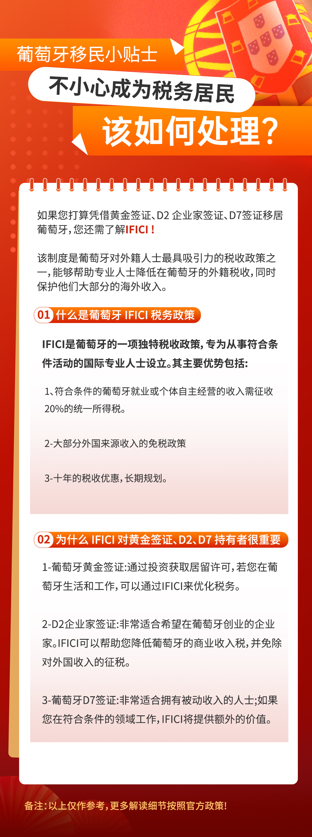 该政策是专门面向外籍人士的税收优惠:符合条件者,其在葡萄牙境内的收入仅按20%的统一税率缴纳所得税,而大部分海外收入可享受免税,优惠期最长可达10年。无论是黄金签证、D2还是D7的持有者,都可以借此优化税务。