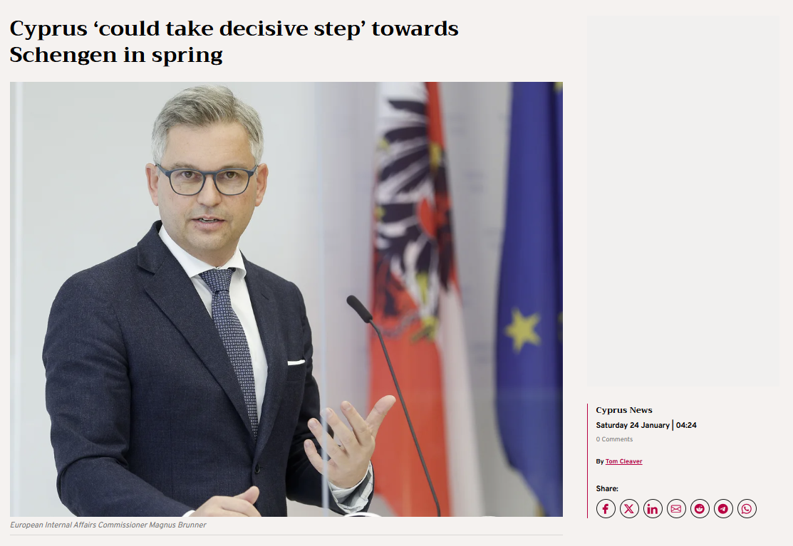 决定性步骤:布鲁纳表示,塞浦路斯最早可能在今年春季,在加入欧洲免边境检查的申根区方面迈出“决定性的一步”。
