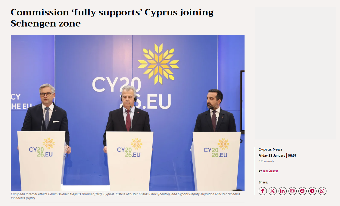 关键报告:欧盟委员会预计将在未来一个月内通过关于塞浦路斯加入申根区的“特别评估报告”。该报告将确认塞浦路斯的技术准备情况。