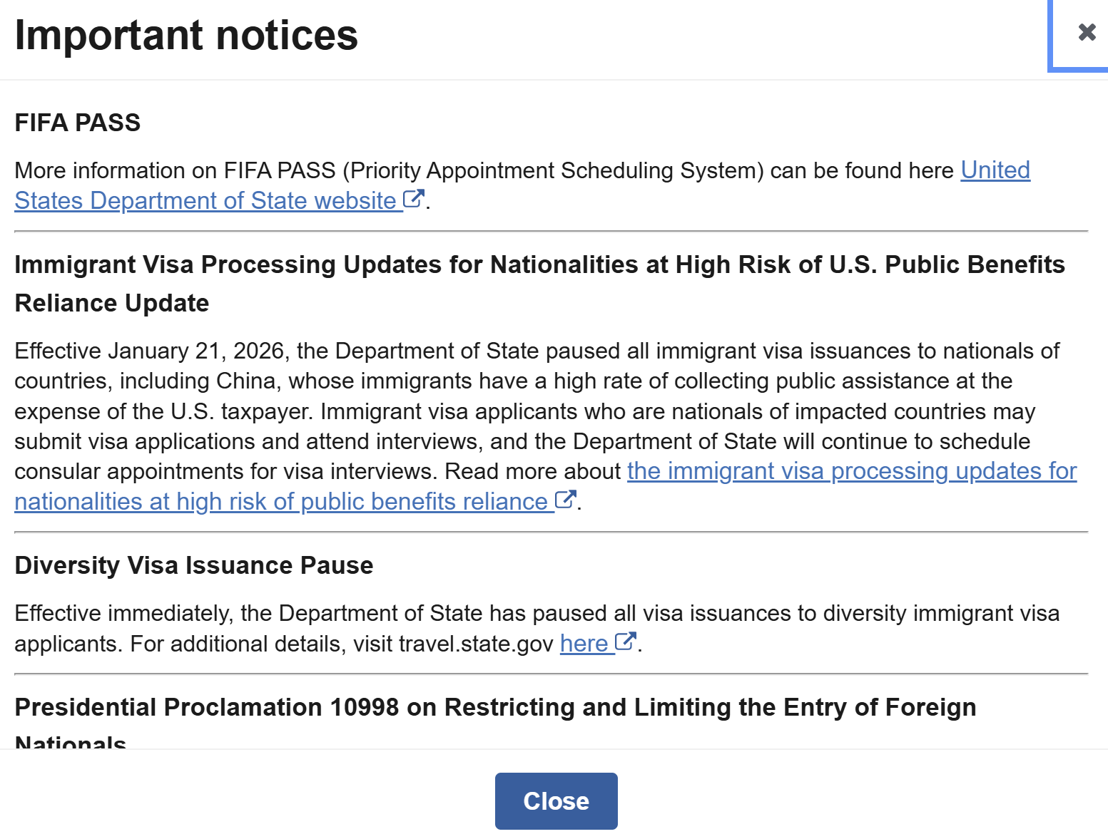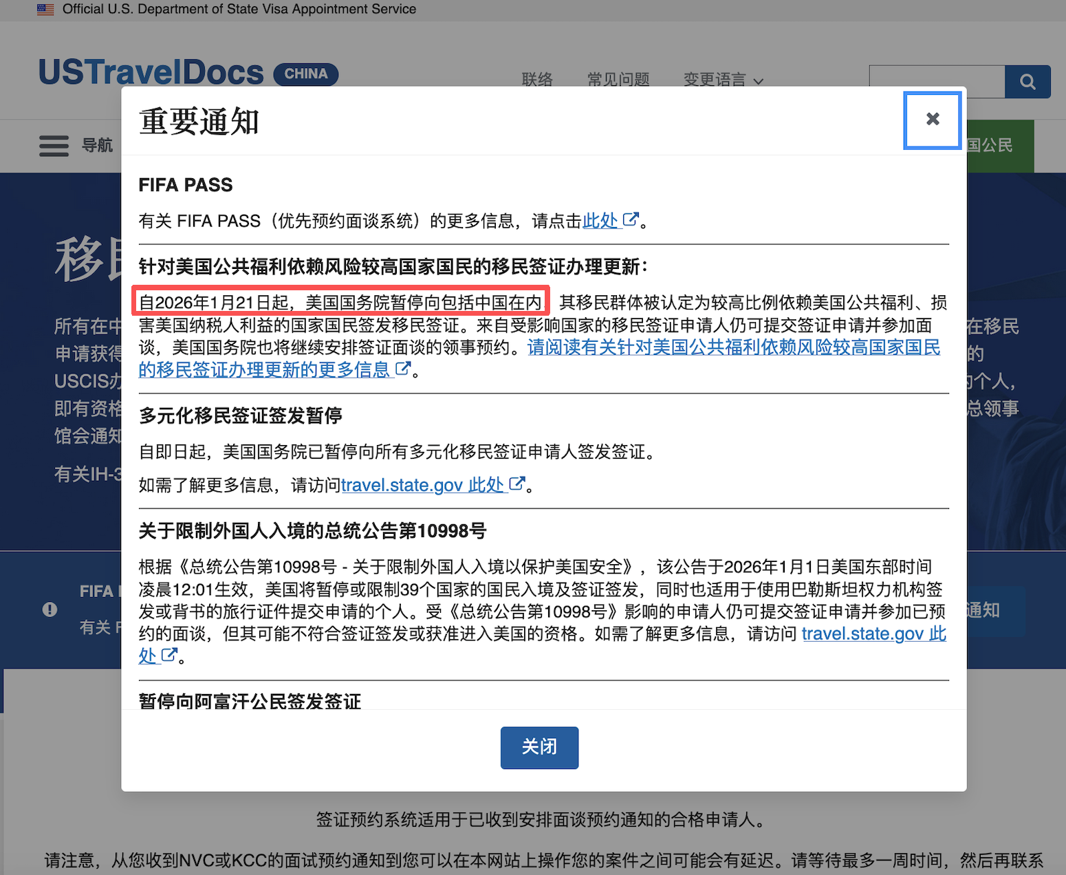 确实,很多人在那个签证预约网站(ustraveldocs)上看到了一个弹窗,说“因为滥用公共福利,2026年1月21日起暂停向包括中国在内的国家发移民签证”。看着挺唬人,感觉像要把中国人的绿卡路给堵死了。